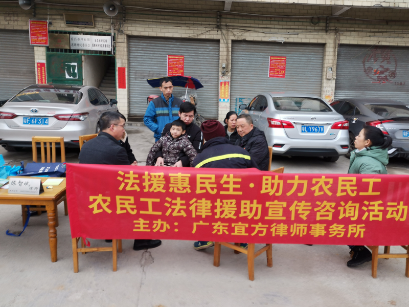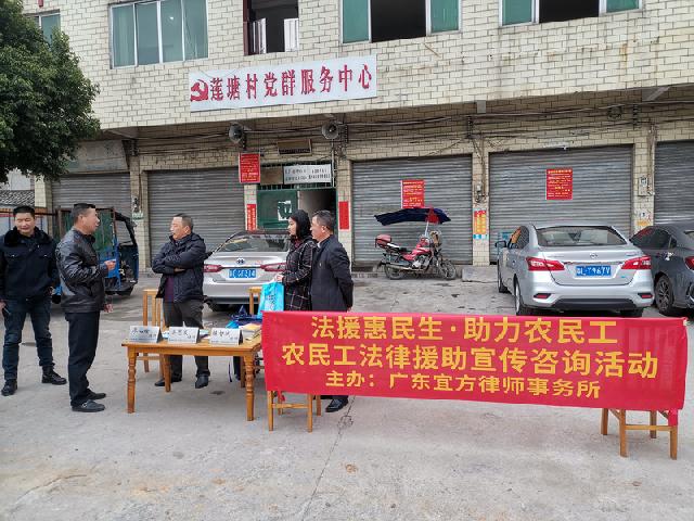 为运用法律手段促进解决农民工权益维护问题,引导农民工的尊法、学法、用法、守法,增强法律意识,以理性合法方式维护自身合法权益,督促企业经营者依法保障农民工合法权益,维护社会和谐稳定,全面推进韶关市“法援惠民生•助力农民工”法律援助品牌建设、民主法治村(社区)建设、美丽乡村建设。2020年1月20日上午,广东宜方律师事务所与乐昌市坪石镇莲塘村委会联合在乐昌市坪石镇莲塘村委会组织开展了一场“法援惠民生•助力农民工”主题法治宣传活动。