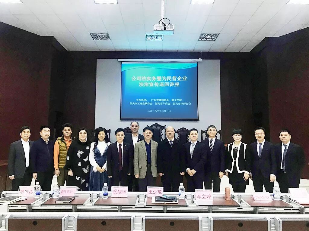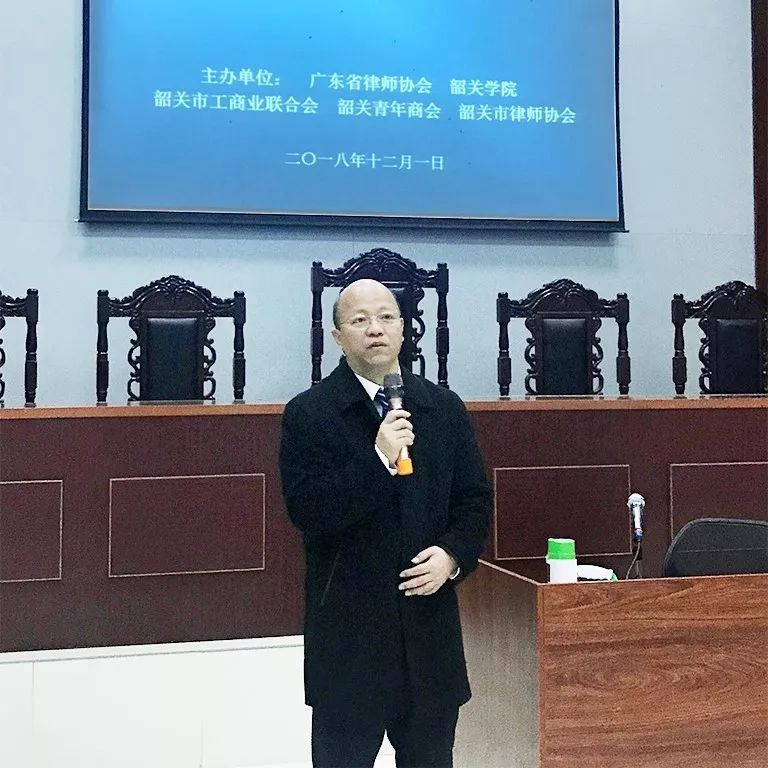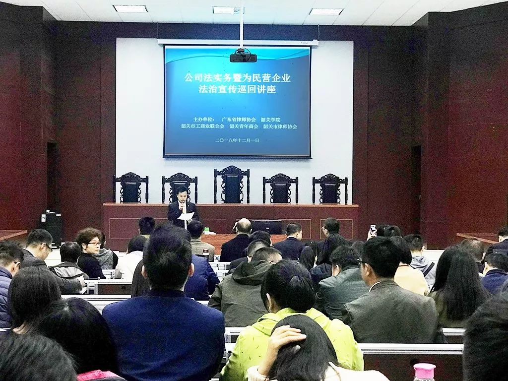 2018年12月1日,省律协公司法律专委会与韶关学院、韶关市工商业联合会、韶关市青年商会、8932彩集团在韶关学院法学院模拟法庭联合举办公司法实务暨为民营企业法治宣传巡回讲座。
